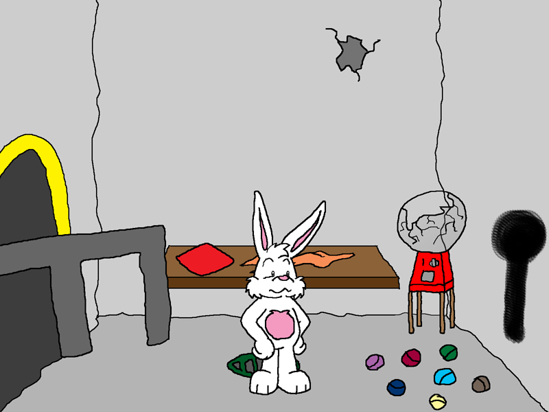 Out of the broken glass of the dispenser, all of the remaining bubble balls fall out onto the floor. The rabbit picks them up, opening them as he goes to bask in their joyous containment.