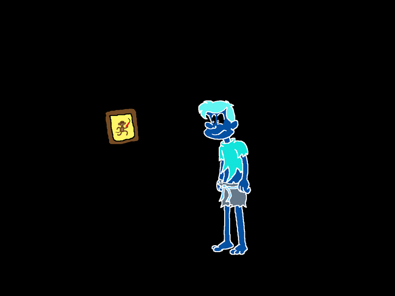 The Inverted Main Character finds himself in a very dark place, much different than he remembered entering the glowing ball from. The monkey eyes him suspiciously.