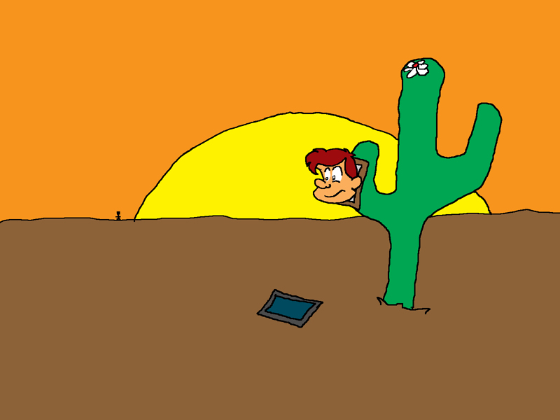 You stick your head through the frame into the picture and look around. Off into the distance, you see the sad pirate walking off around the sunset (it burns if you walk into it). You are too far away to call for him, and he's to depressed to care even if you could.