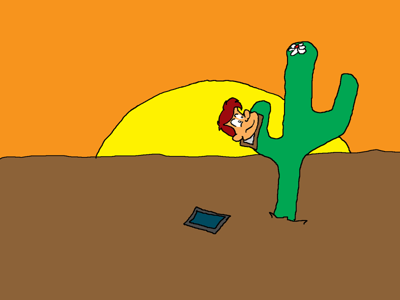 You look up to the cactus flower and attempt to sniff it. Surprised by the unwanted attention, the flower tries to move away and eyes you nervously.