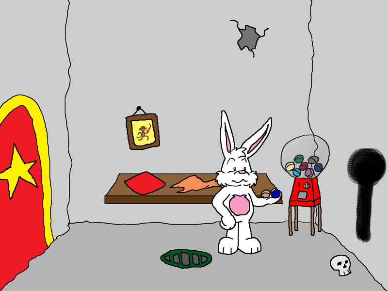 Rabbit: Get the TNT from the monkey in the picture so you can blow your way out of there.
