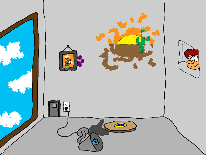 Zooming through the room, Gilbert heads through the picture frame into the orange world (he decides heading through the interdimensional rift isn't the safest thing to do). Poking his head around, he sees that there isn't much there besides the other side of the rift, and his boots would not be able to travel fast enough to efficiently explore the world.
