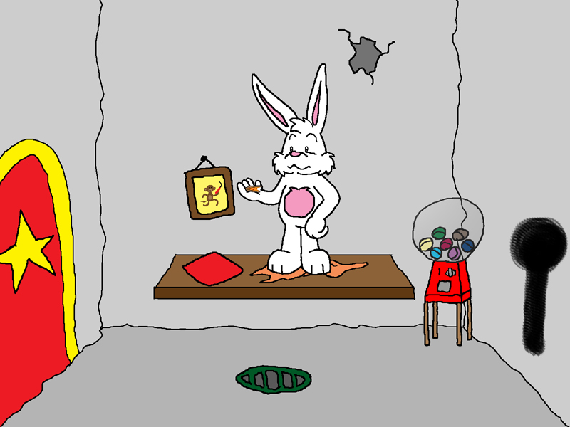 However, he begins to smell the scent of bananas wafting from the other room and goes into a fit. The rabbit asks the unknown entity beyond the wall to provide bananas for the monkey, and you toss them through the hole. The rabbit modifies his offer and submits the bananas, and the monkey seals the deal.