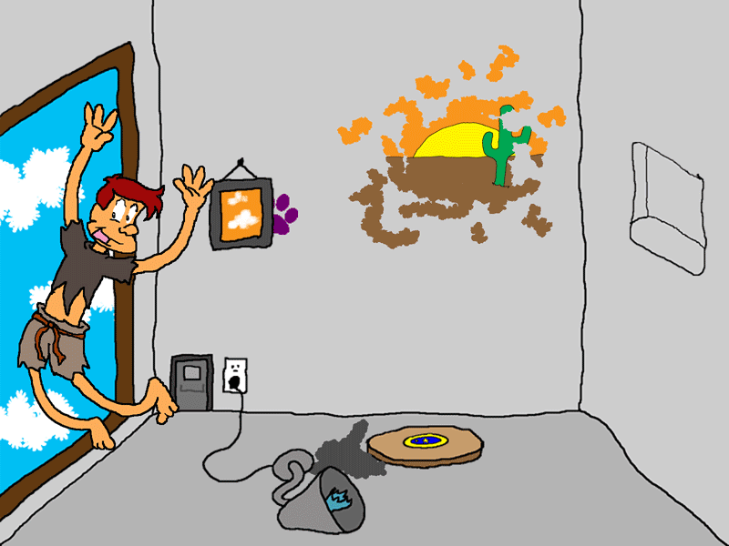 Now that the laser defense system has been neutralized, you scramble through the window of your room. Filled with a sense of freedom, you excitedly hop through the frame into the great blue world.