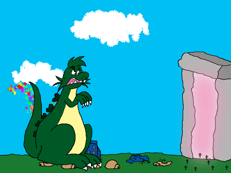 The giant lizard decides to prevent you from ever returning to this world, and uses his fire breath to destroy the portal.