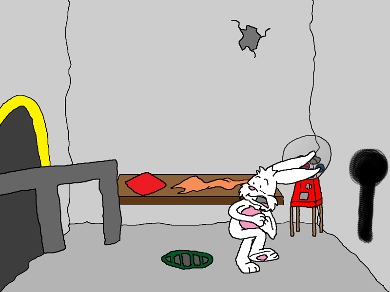 The rabbit is surprised by the sudden giant key prongs protruding from his door without notice.